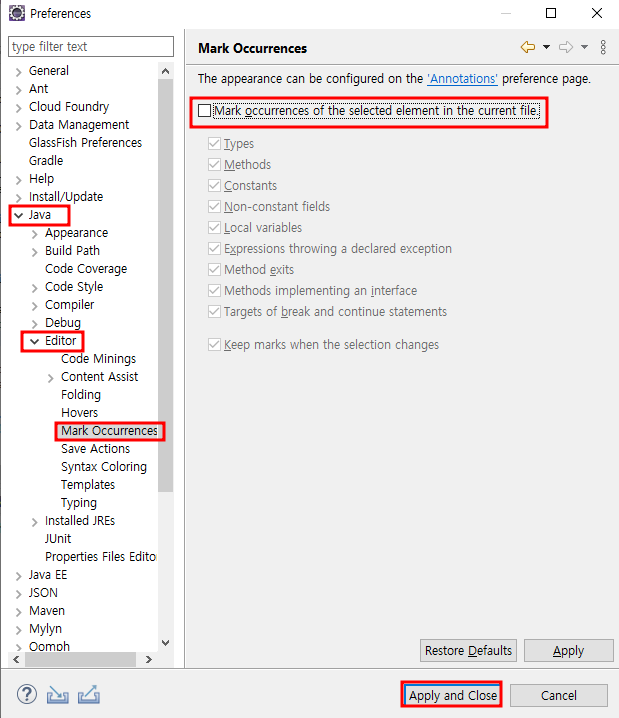 window > properties > java > editor > mark occurrences > Mark occurences of the selected element in the current file 체크 해제