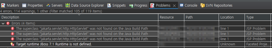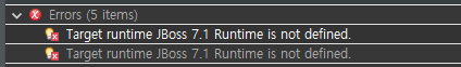 그럴경우 Target runtime JBoss 7.1 Runtime is not defined. 오른쪽 클릭 > Quick Fix >