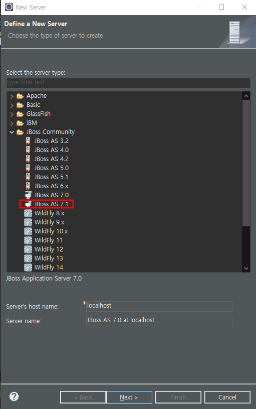 2. server > No servers are available. Click this link to create a new server.. 클릭 > JBoss Community > 원하는 jboss 버전 선택 > next