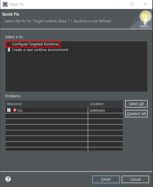 Configure Targeted runtimes 클릭 후 finish > 기존에 추가한 runtime apply > 해결