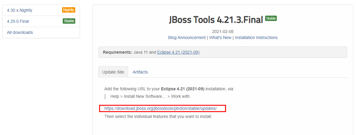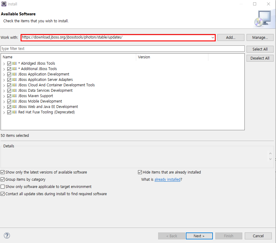 이런 경우 https://tools.jboss.org/downloads/archives.html 해당 사이트에 들어가 본인의 이클립스 버전에 맞는 JBoss tool을 설치한다.)