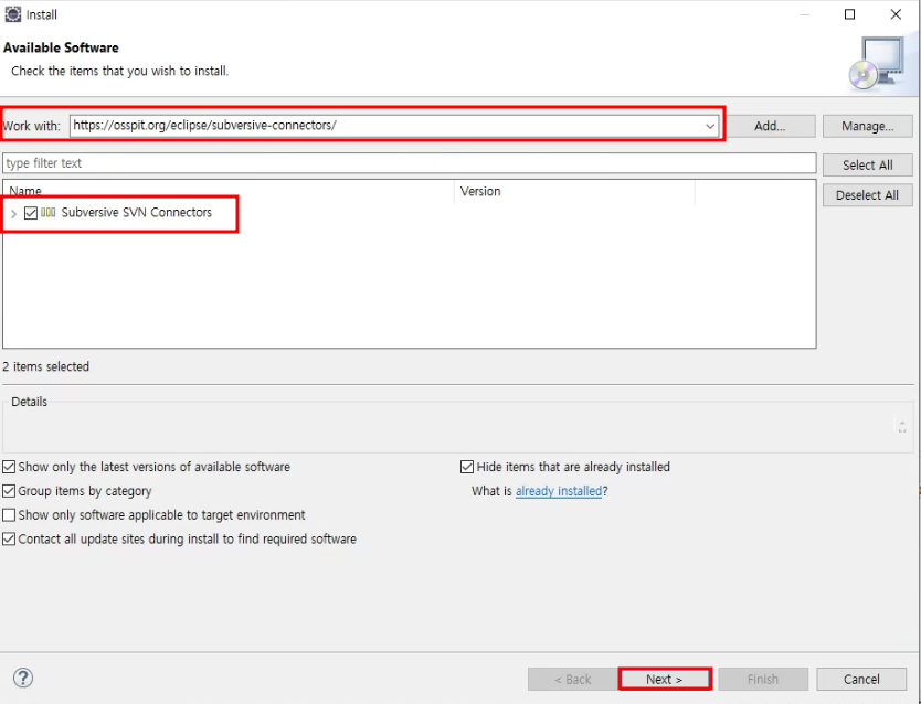 1. 만약 위의 방법으로 connector가 안나오는 경우 Help > install new software > work with 에 connector 위치 입력https://osspit.org/eclipse/subversive-connectors/