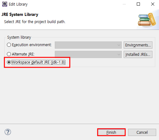 프로젝트 우클릭 > build path > configure Build Path > Libraries 탭 > JRE System Library 클릭해 workspace default JRE로 체크 박스 변경 후 Finish